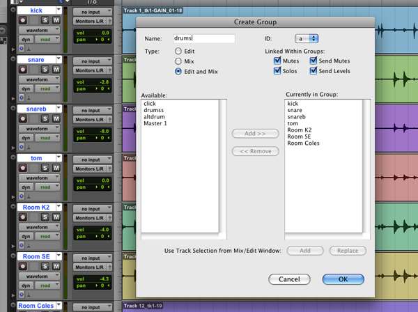 First create a group out of your drums, select each of the drum tracks while holding down the shift key. Now press command+G to bring up the group window