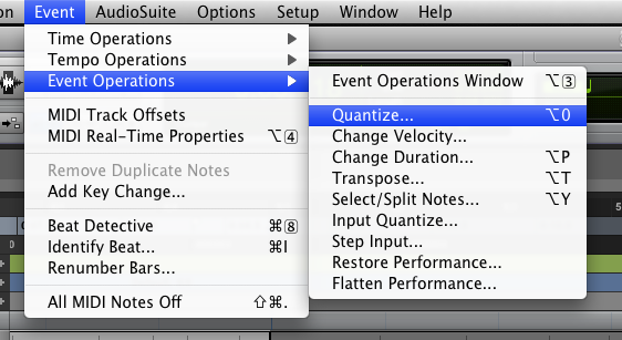 Now with your loop still selected, go to the event window and choose “Quantize” from the Event operations tab.