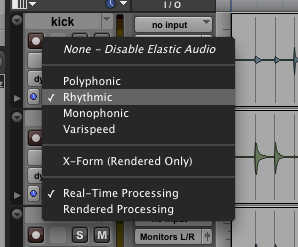 I have chosen “Rhythmic” as this is drums and therefore transient, precisely what the rhythmic algorithm was created for. Once selected it will place the elastic audio plugin on each of the tracks in your drum group.