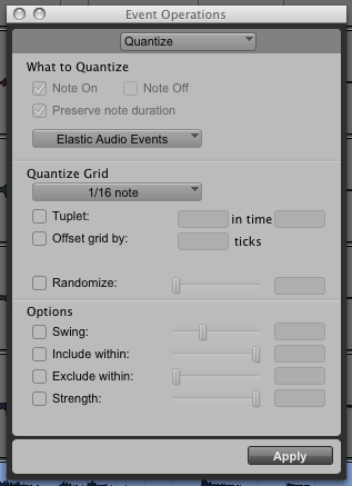 The event operations window will pop up, select the desired quantizing parameters and click apply. I have chosen 16th notes to suit the 16th note kick drum.