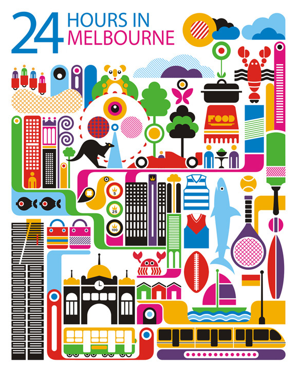 Q Tell us about your 24 Hours themed illustrations for Oryx Magazine. How was the concept developed? What planning or research was required to do keeping in mind the specialties of the city that you were illustrating?