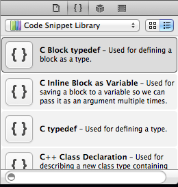 Feel free to browse the snippets that XCode ships with, however most of them are not very useful. So, now this is where I feel Apple engineers were a little too clever. It took me a little while to figure out how to actually add a new snippet. You would expect some sort of + button or something. The way you add a new snippet in this case is to write out a chunk of code and drag it into the Code Snippet Library window.