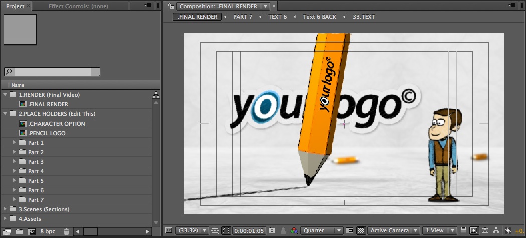 User guide is included. Advanced After Effects users can change everything including length, number of video displays, background, floor, camera angles, 3D pencil movement, 3D compositions fully editable!