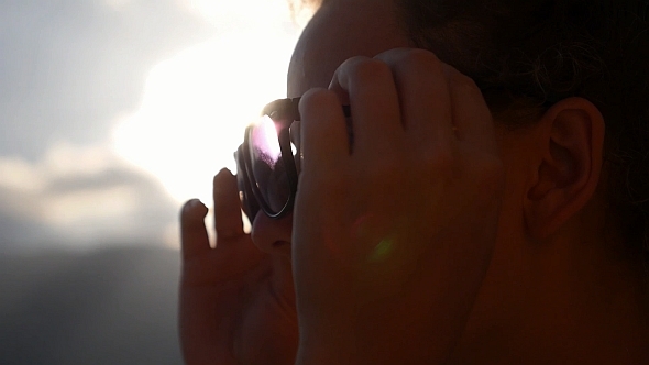 Young Charming Cu Female with Curly Hair Smiling Wearing Sunglasses Looking on Beautiful Seashore from View Point. Slow Motion. HD 1920×1080
