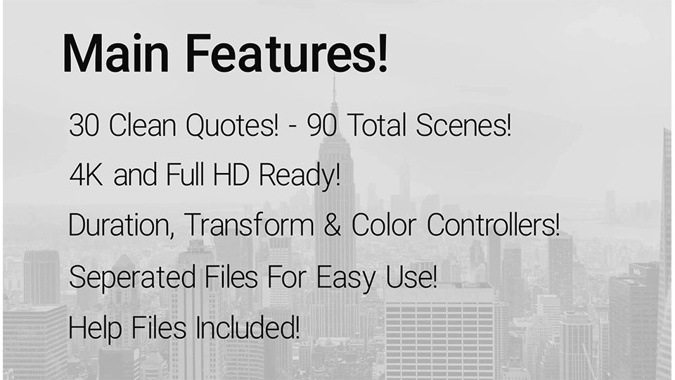 This project is great For Youtube Videos, Motivational Videos, Brand Promotions and Anywhere where you would need to show a quote animation. We have Included almost every type of design From Simple Text to Complex Shapes to Image and Logo Holder Quotes!